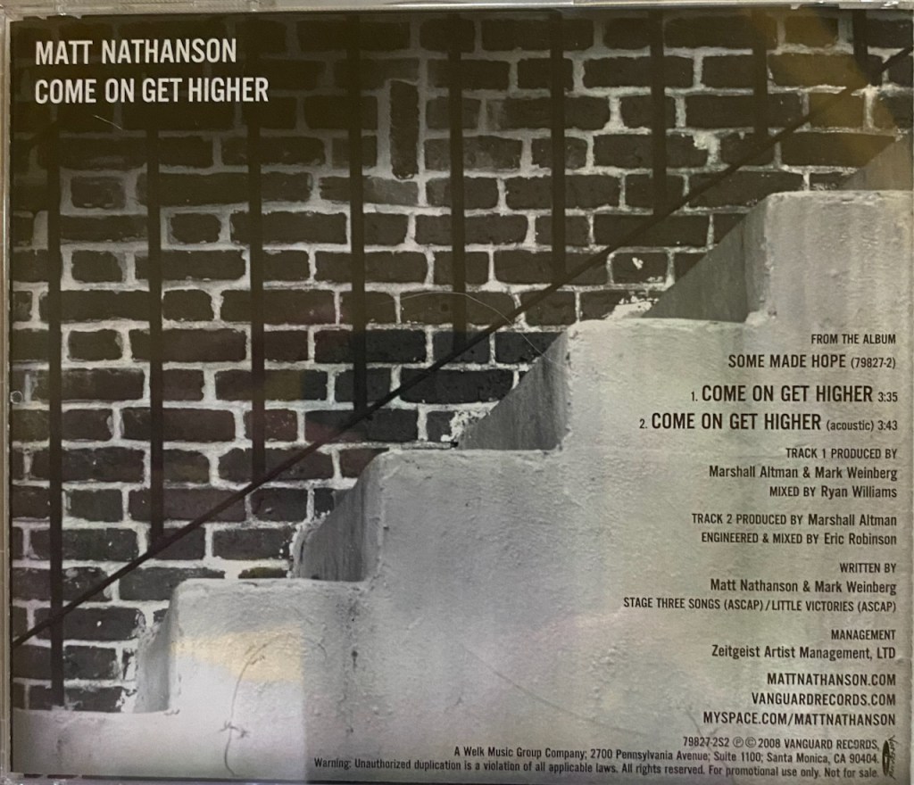 Now that I’ve collected all of Matt Nathanson’s studio and live albums on CD and vinyl, I have moved on to collecting all the promo CDs that were sent to radio DJ’s around the globe. I have been using eBay and Discogs to track those down and I have a pretty good start and hope to finish by year end. This one here is a really cool one in that it not only has the studio version of one of my favorite Matt Nathanson songs, “Come On Get Higher”, but it also has an unreleased acoustic version of the song. Yes, please!!